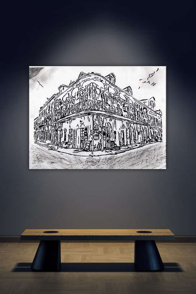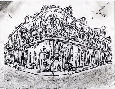 This bold black-and-white sketch captures a classic French Quarter corner, where wrought-iron balconies wrap the building like lace frozen in time....