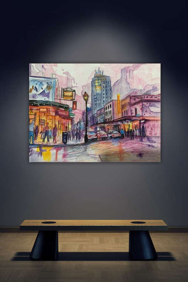 This artwork captures a city moment suspended between day and night, where soft pink skies wash over a lively street corner. The tall build...