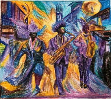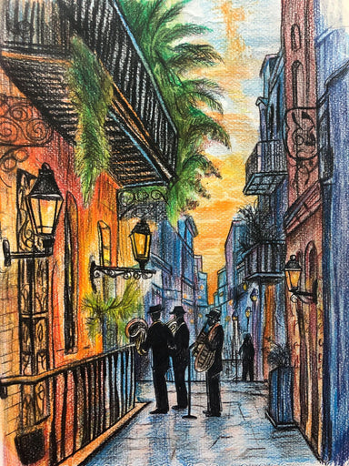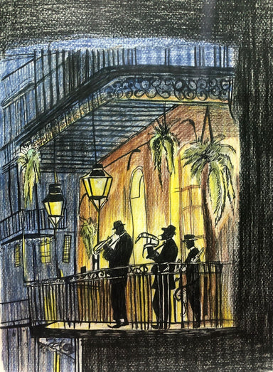 This vibrant drawing brings a French Quarter balcony to life with warm golden light spilling from historic lanterns and windows. Three jazz musicia...