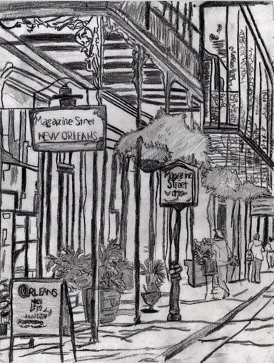 This detailed graphite drawing frames Royal Street as a quiet corridor between history and skyline. Ornate balconies and shuttered façades lead the...