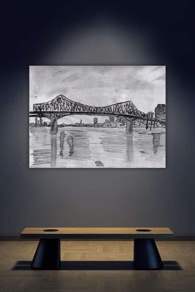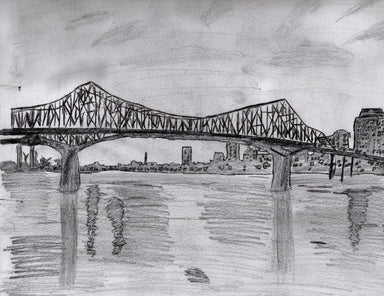 This graphite drawing captures a quiet moment along the Mississippi River, where a steel bridge stretches gracefully between shores. Reflections ri...