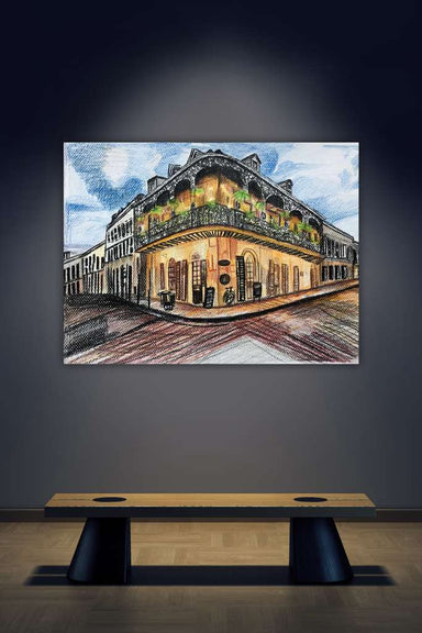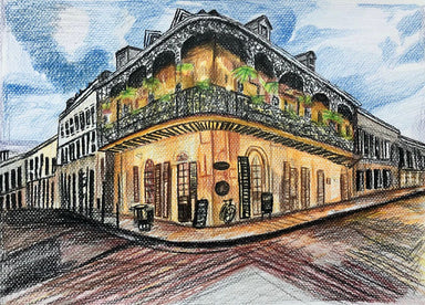 This bold black-and-white sketch captures a classic French Quarter corner, where wrought-iron balconies wrap the building like lace frozen in time....