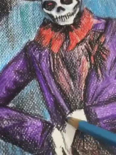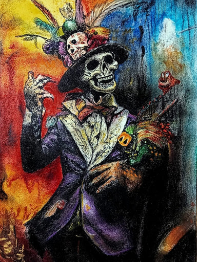 He steps from the veil with a grin full of riddles,a skeleton dressed in midnight velvet and voodoo charm.Feathers dance on his crown like whispers...