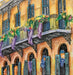 Sun-warmed apricot stucco and lacy black iron glow under Mardi Gras colors. Purple, green, and gold beads hang like vines from the balcony, while turquoise shutters stand open, catching the breeze and the last stray strands of Carnival glitter. A joyful, frozen moment when the party lingers in the flowers and the light.