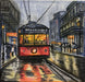 A glowing New Orleans streetcar breaks through a rainy night, reflecting vibrant colors on slick streets. Passengers find warmth and light inside while umbrellas parade along the sidewalks. This piece captures the irresistible charm and motion of the Crescent City, even in the storm.