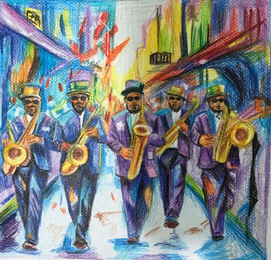 This vibrant piece captures the unstoppable energy of a New Orleans brass band marching straight toward the viewer. Dressed in sharp suits and tilt...